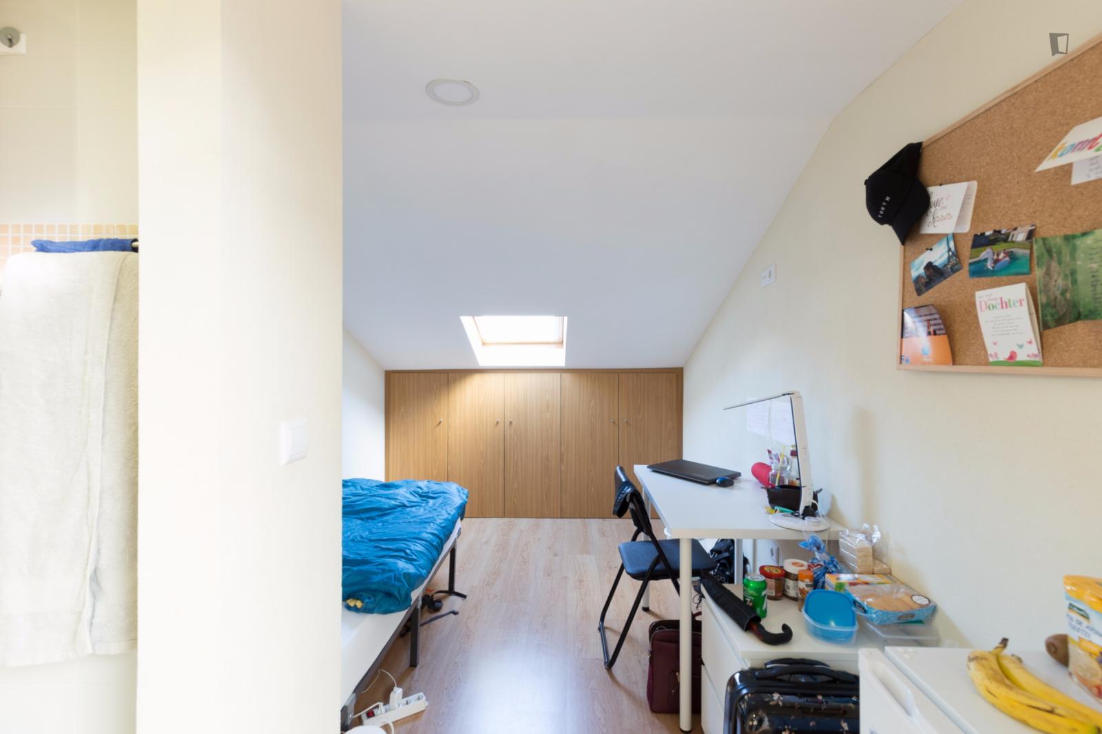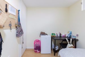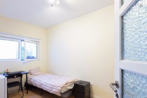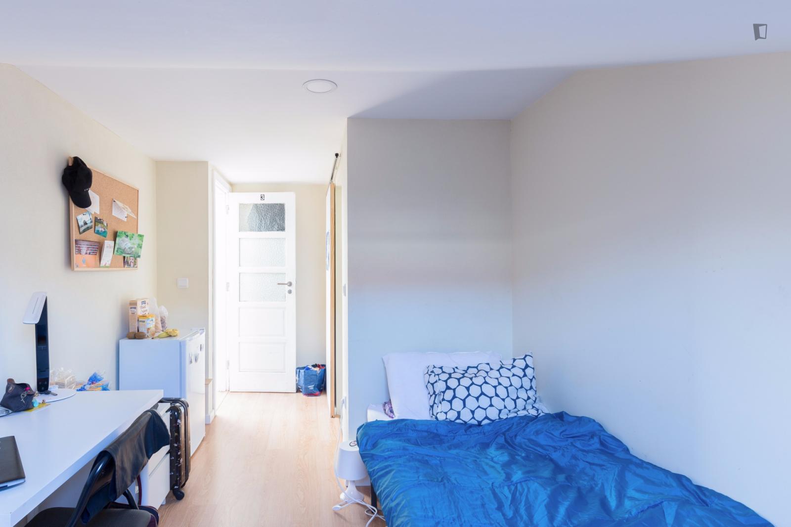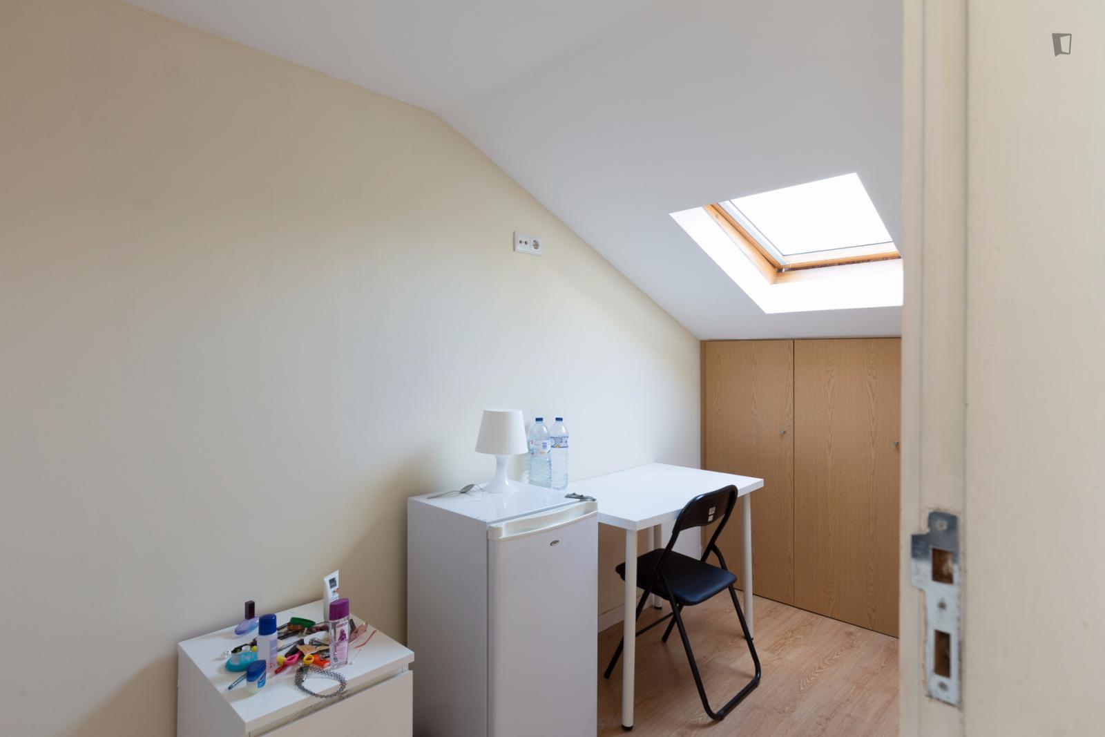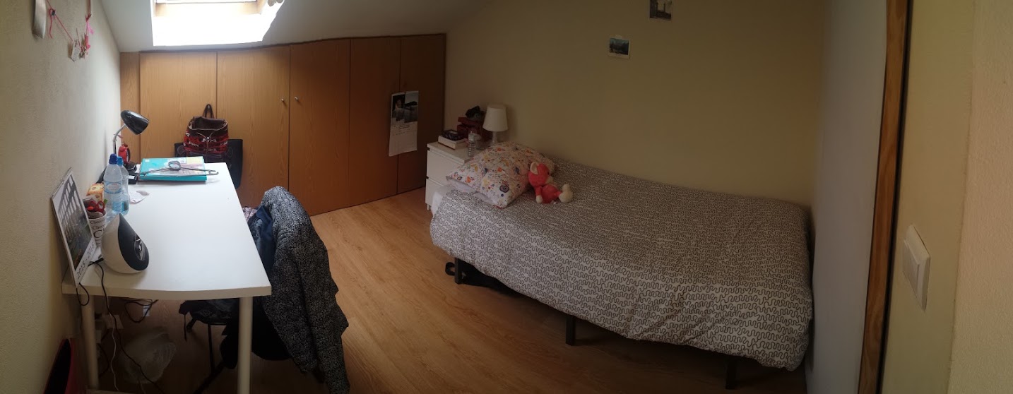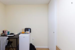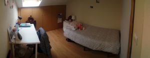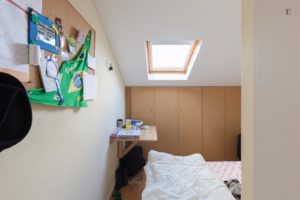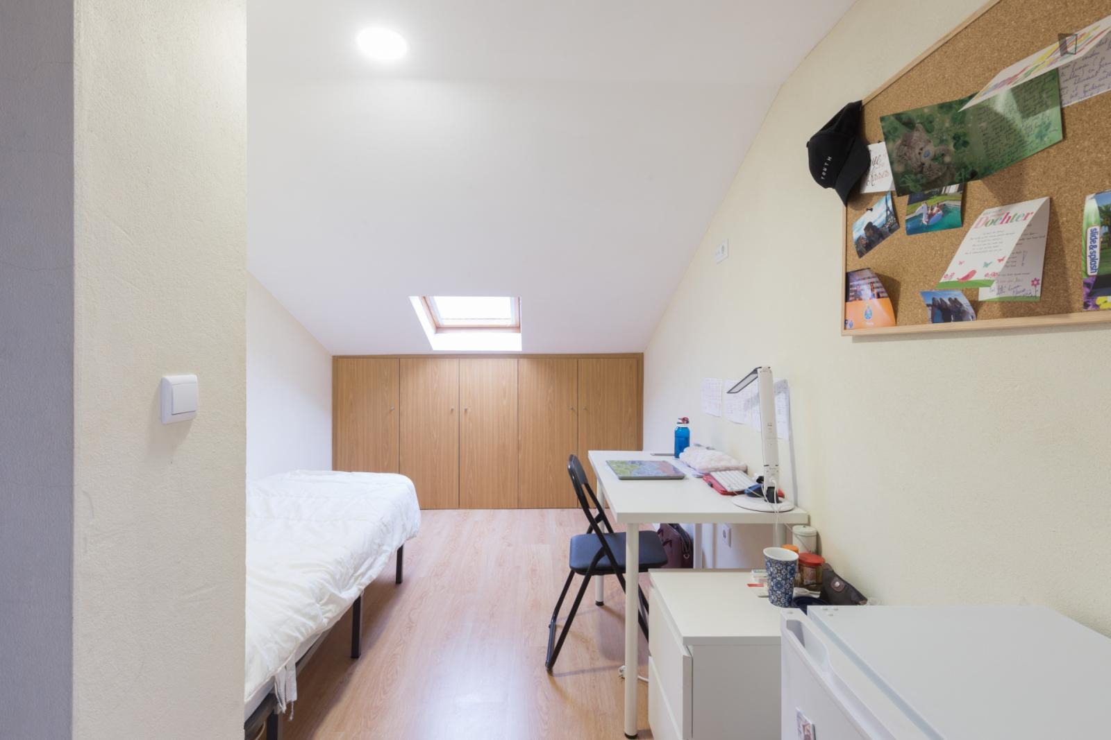 At 9 m2 (plus a 2.5 m2 bathroom) it’s the smallest room in the house. It’s located on the roof and has a large closet. Since the room is small, its fridge is in the closet and its desk is close to the wall — One of the quietest rooms in the house.