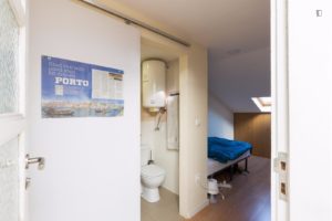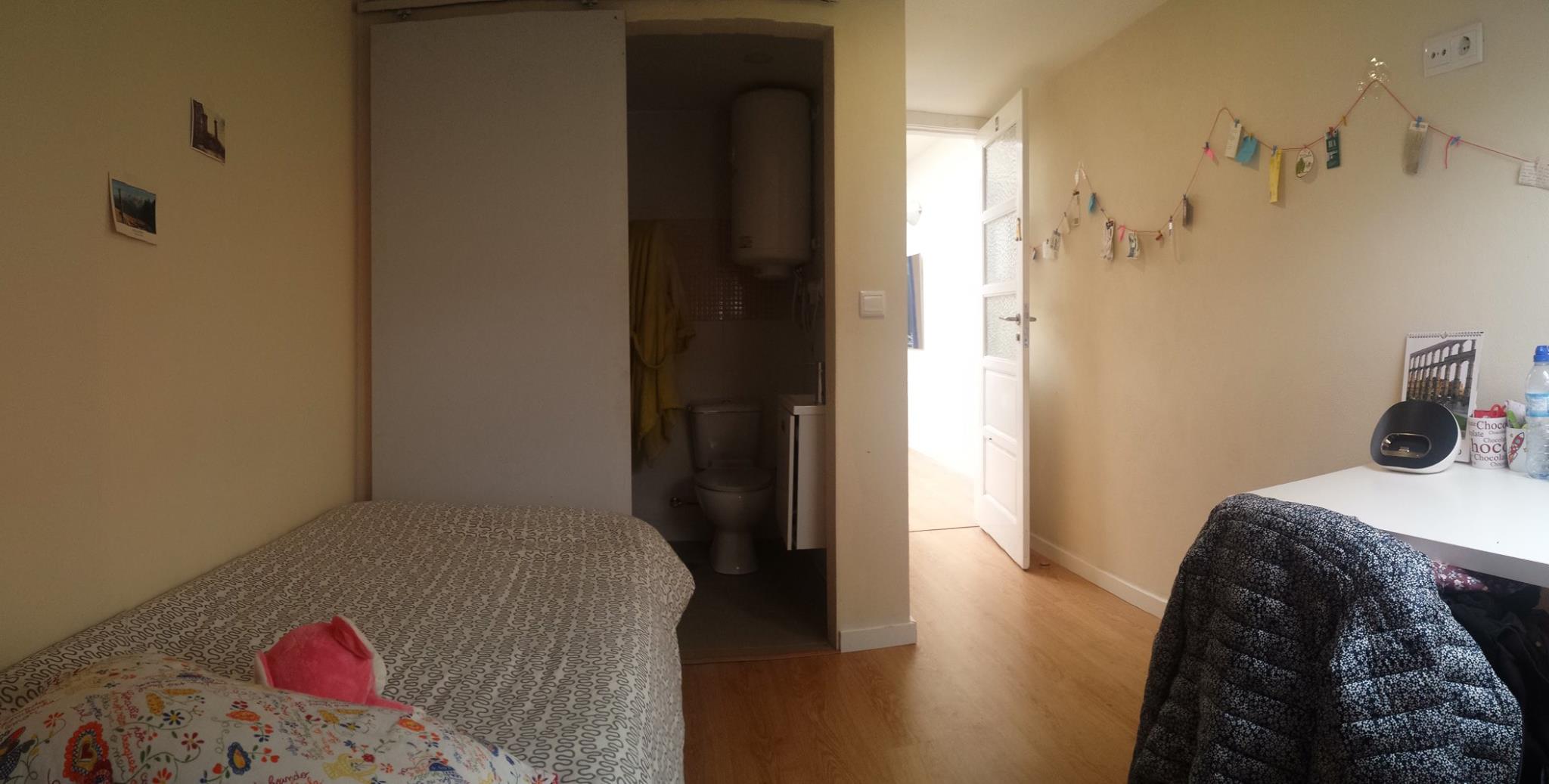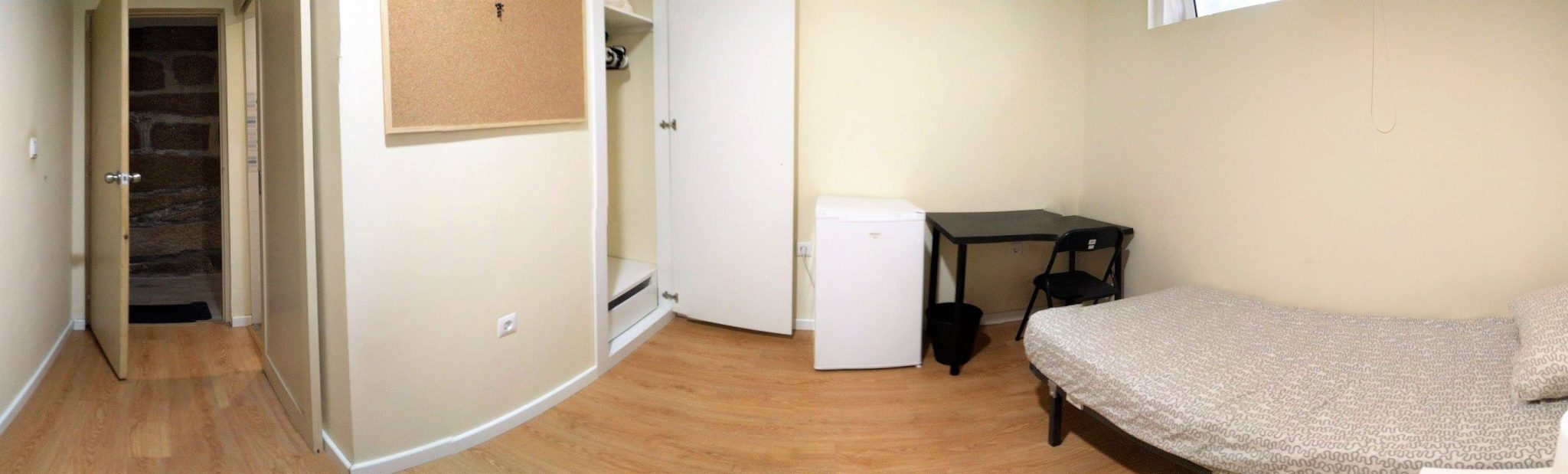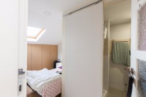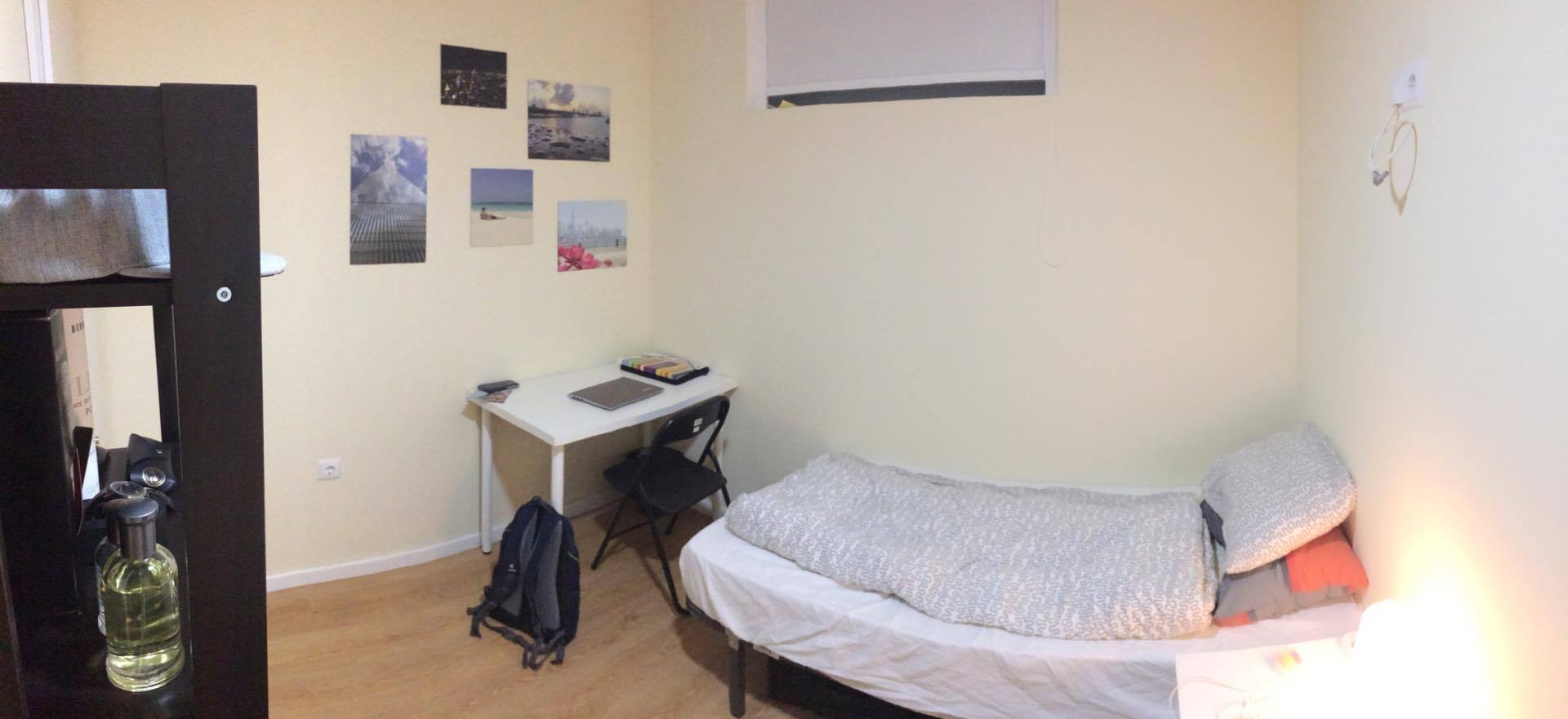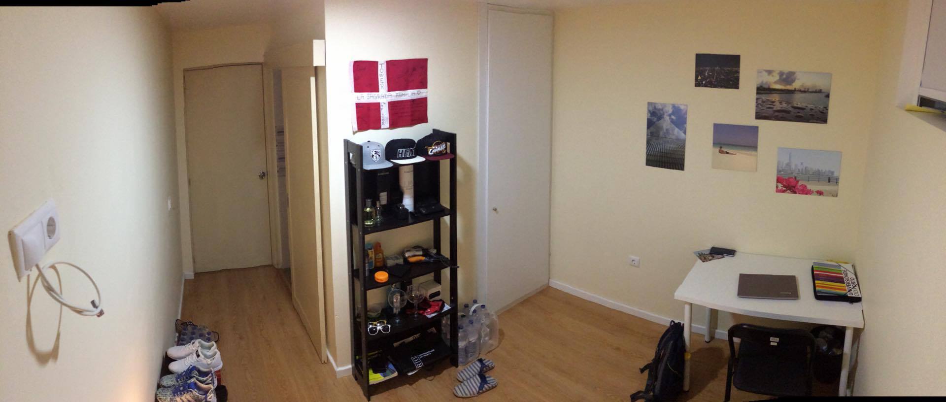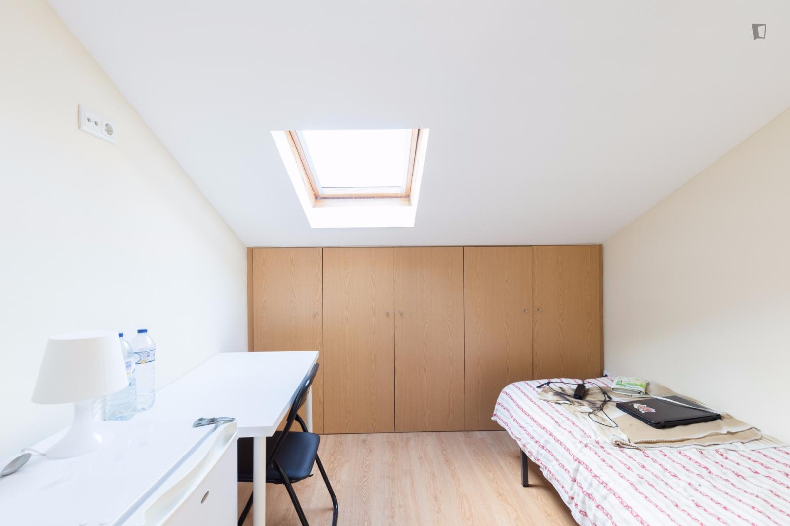 At 9 m2 (plus a 2.5 m2 bathroom) it’s the smallest room in the house. It’s located on the roof and has a large closet. Since the room is small, its fridge is in the closet and its desk is close to the wall — One of the quietest rooms in the house.