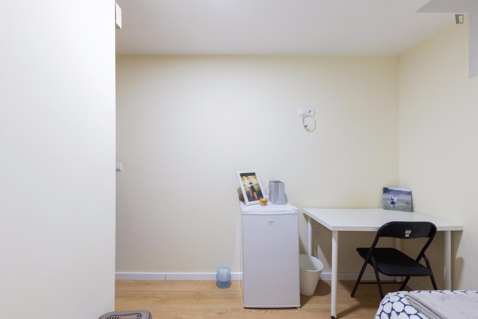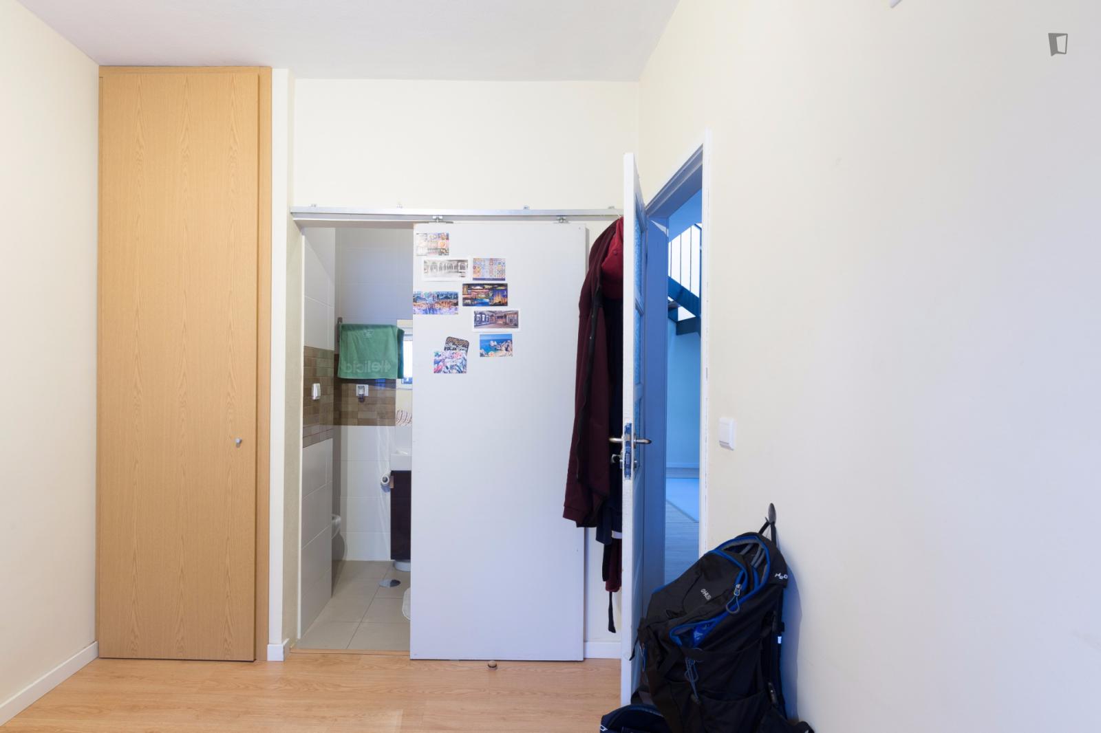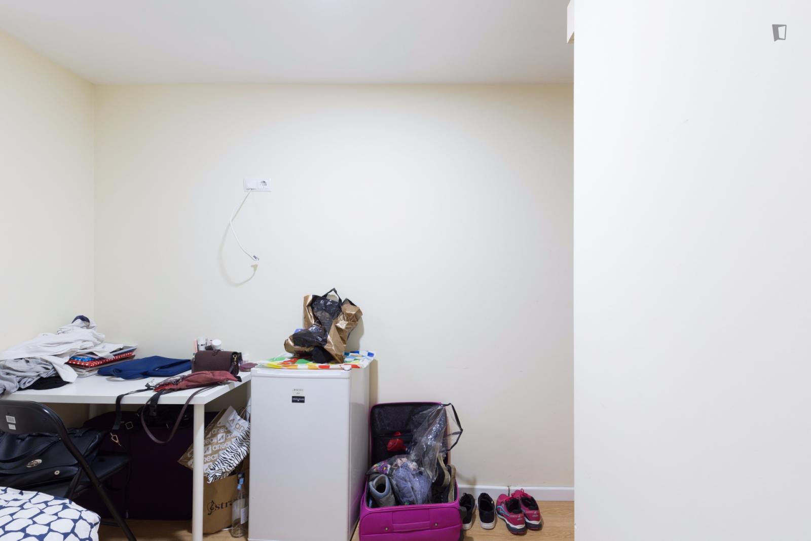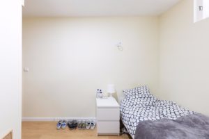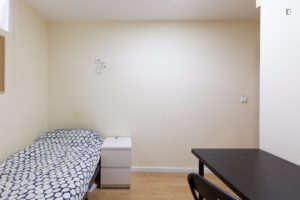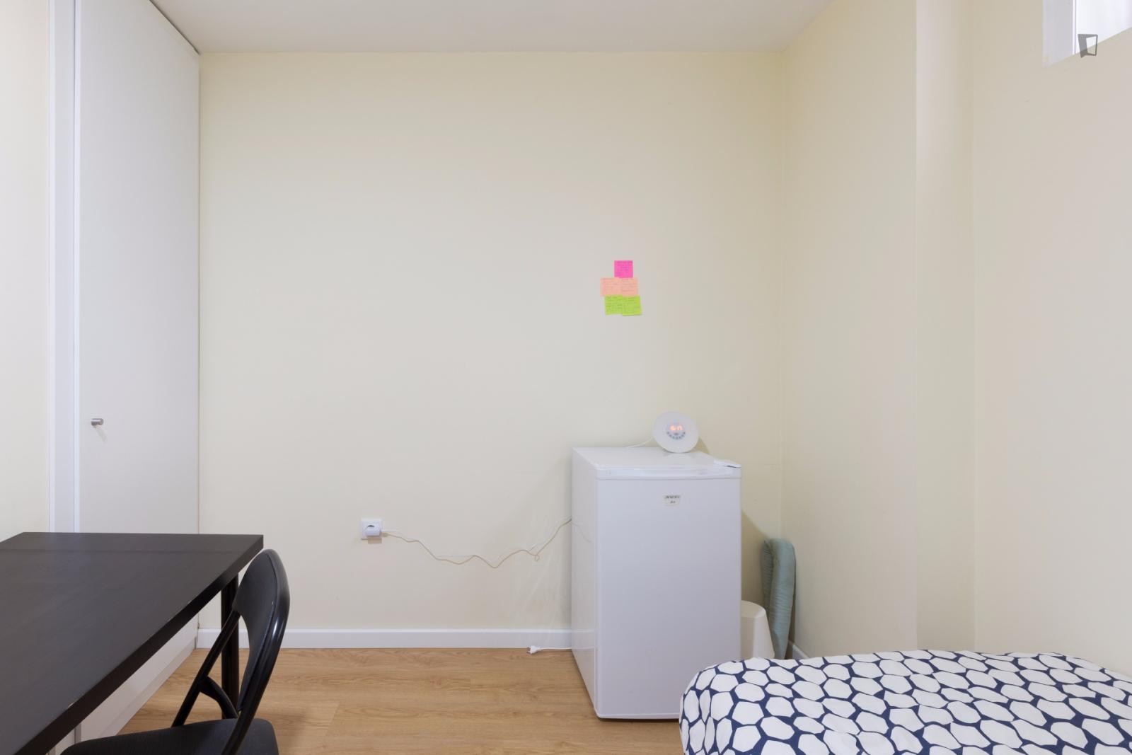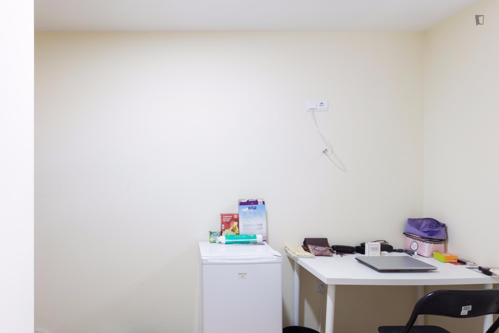 At 9 m2 (plus a 2.5 m2 bathroom) it’s the smallest room in the house. It’s located on the roof and has a large closet. Since the room is small, its fridge is in the closet and its desk is close to the wall — One of the quietest rooms in the house.