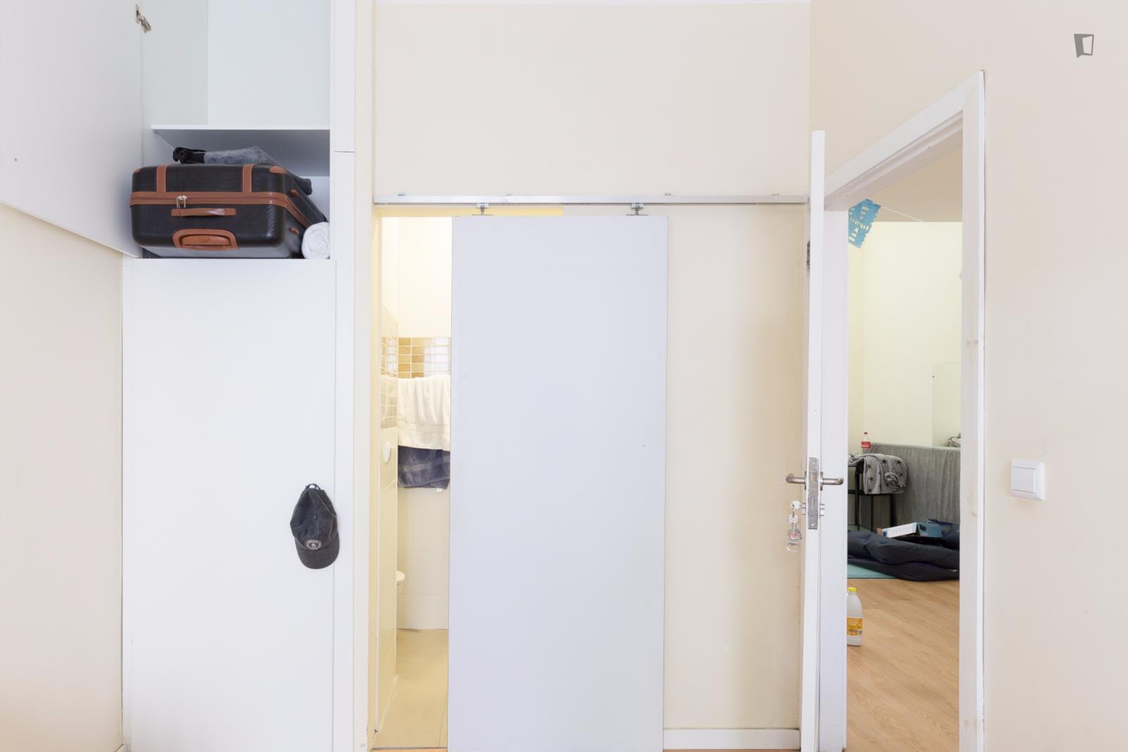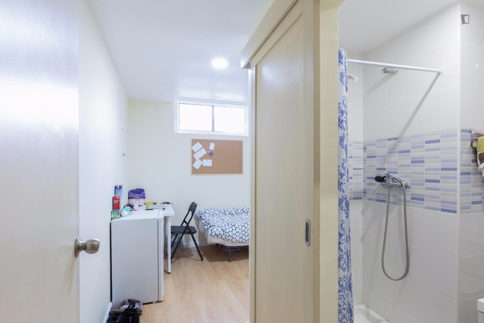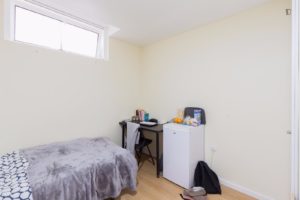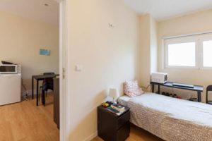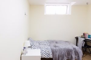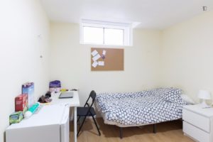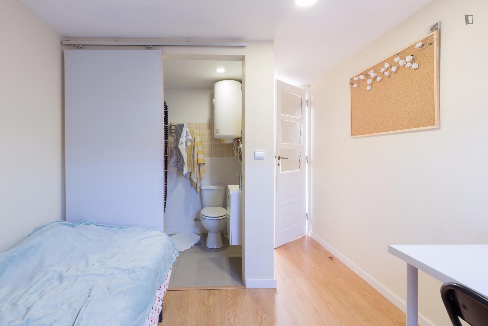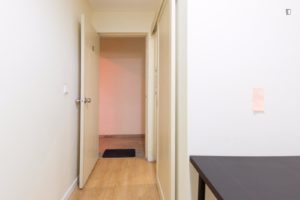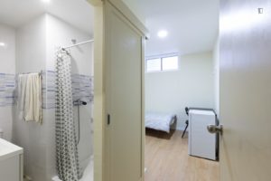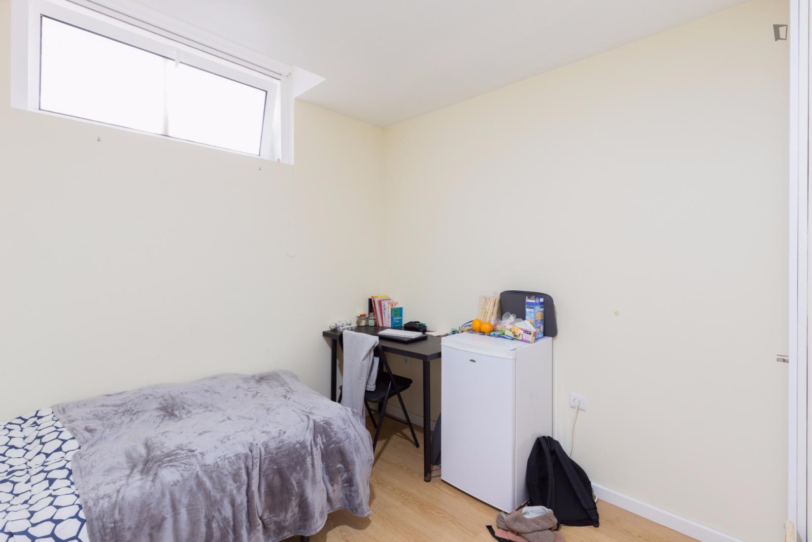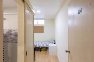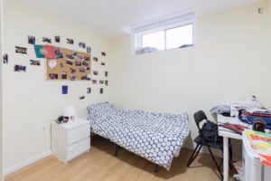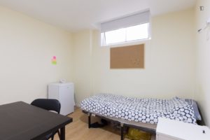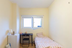 At 9 m2 (plus a 2.5 m2 bathroom) it’s the smallest room in the house. It’s located on the roof and has a large closet. Since the room is small, its fridge is in the closet and its desk is close to the wall — One of the quietest rooms in the house.
