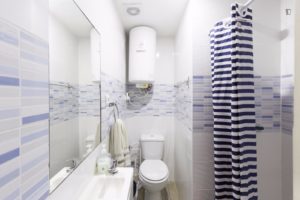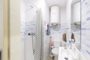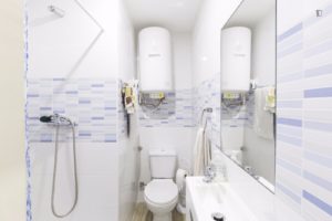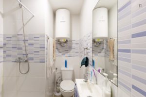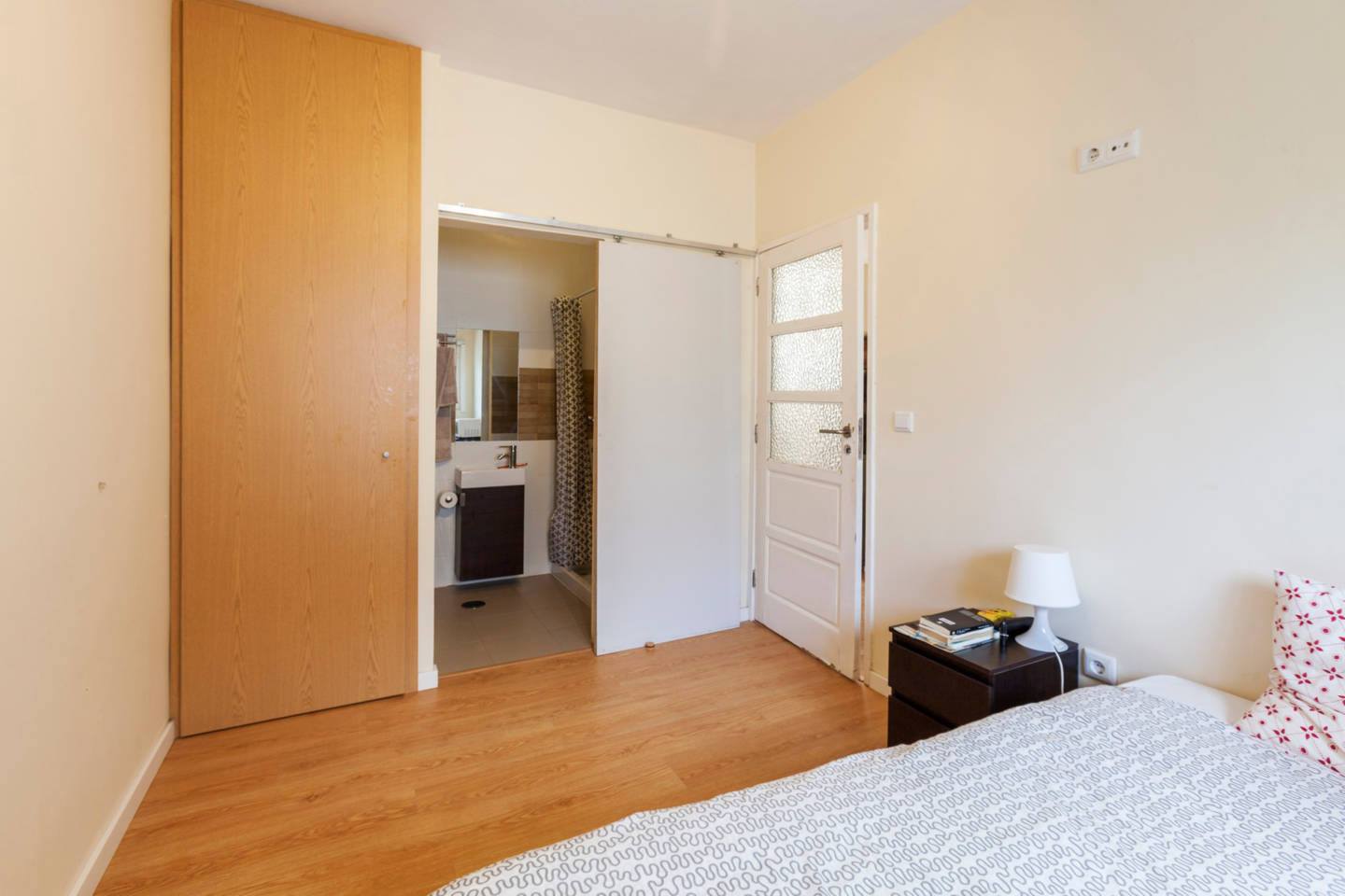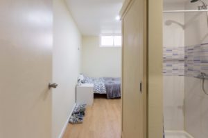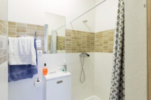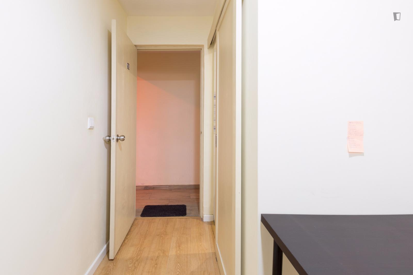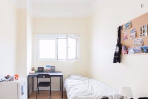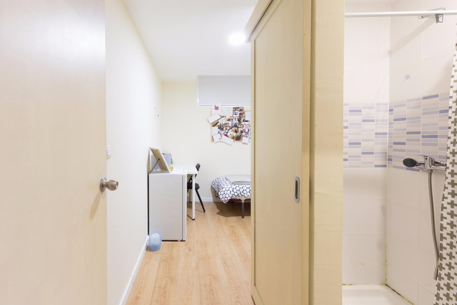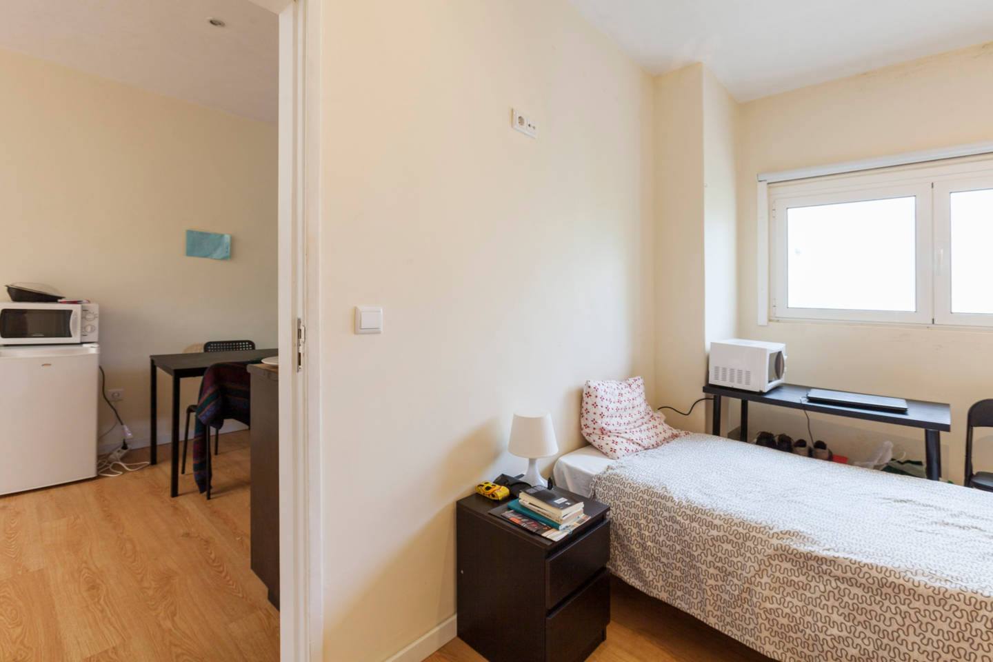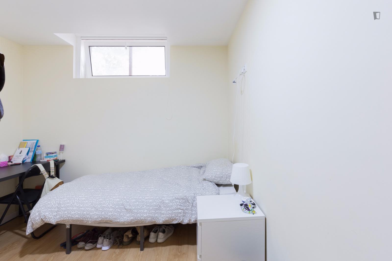 At 9 m2 (plus a 2.5 m2 bathroom) it’s the smallest room in the house. It’s located on the roof and has a large closet. Since the room is small, its fridge is in the closet and its desk is close to the wall — One of the quietest rooms in the house.