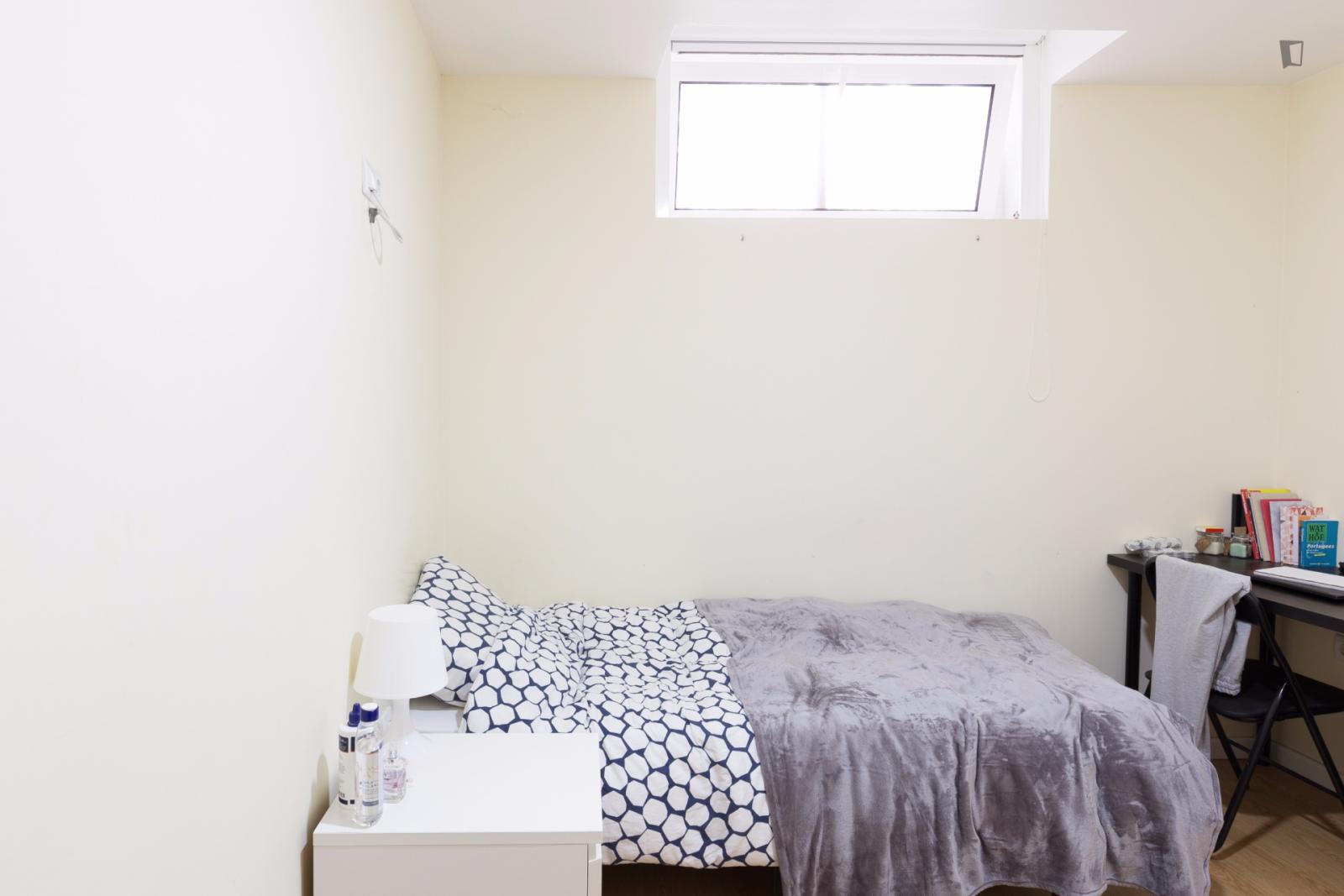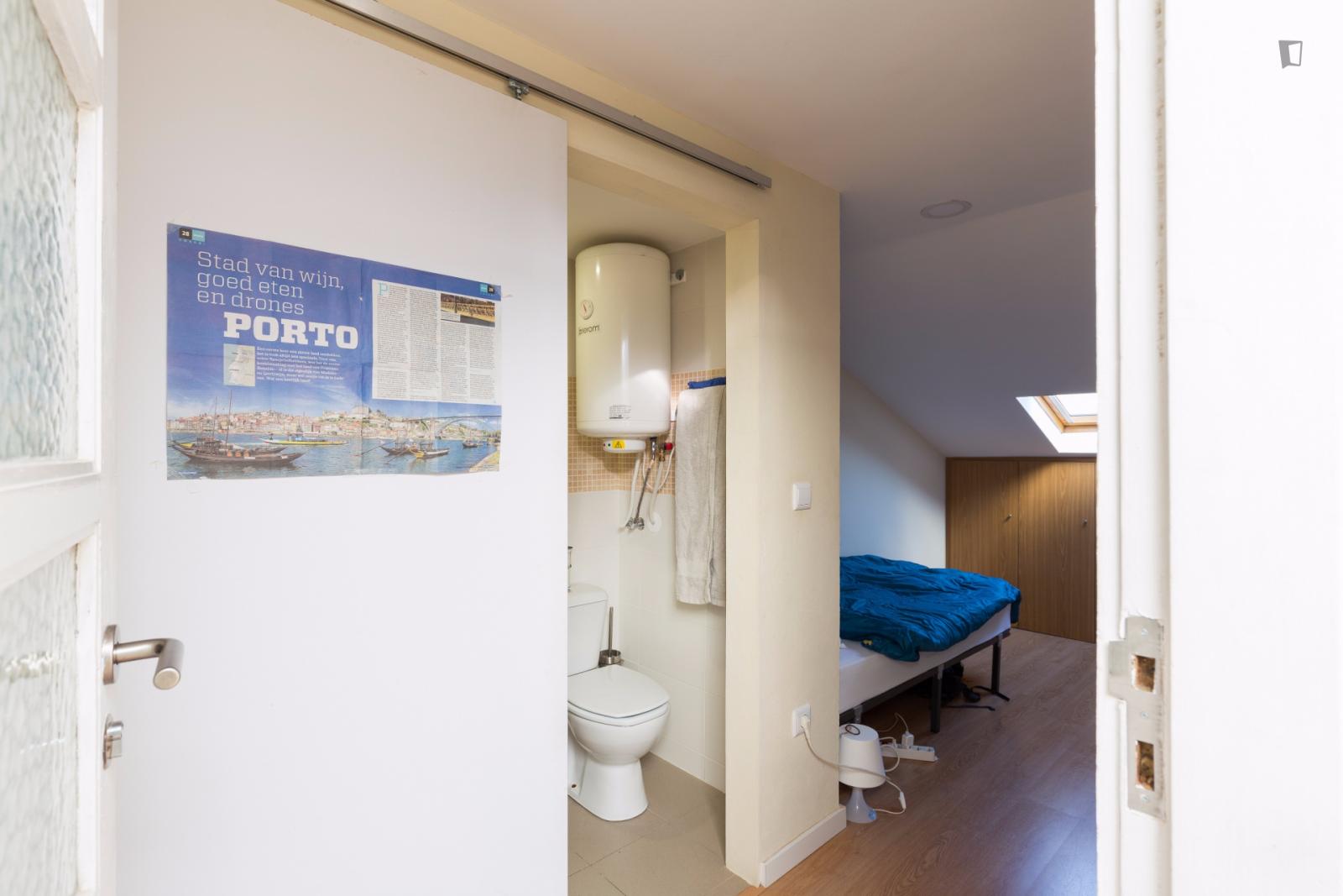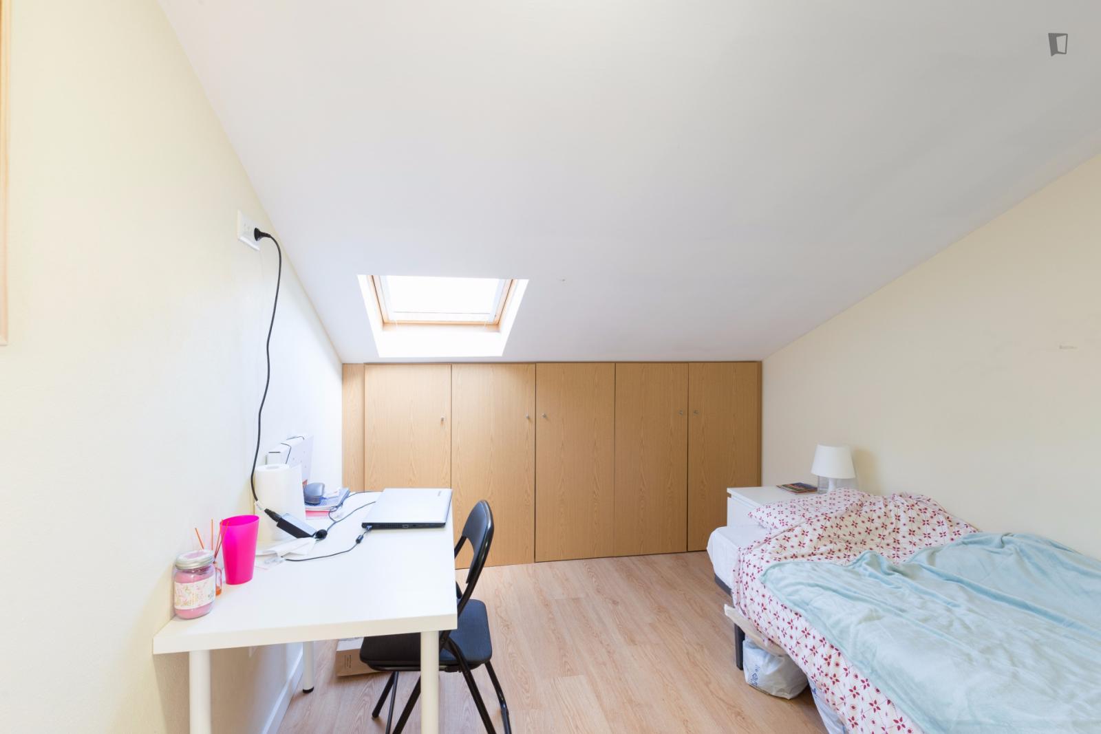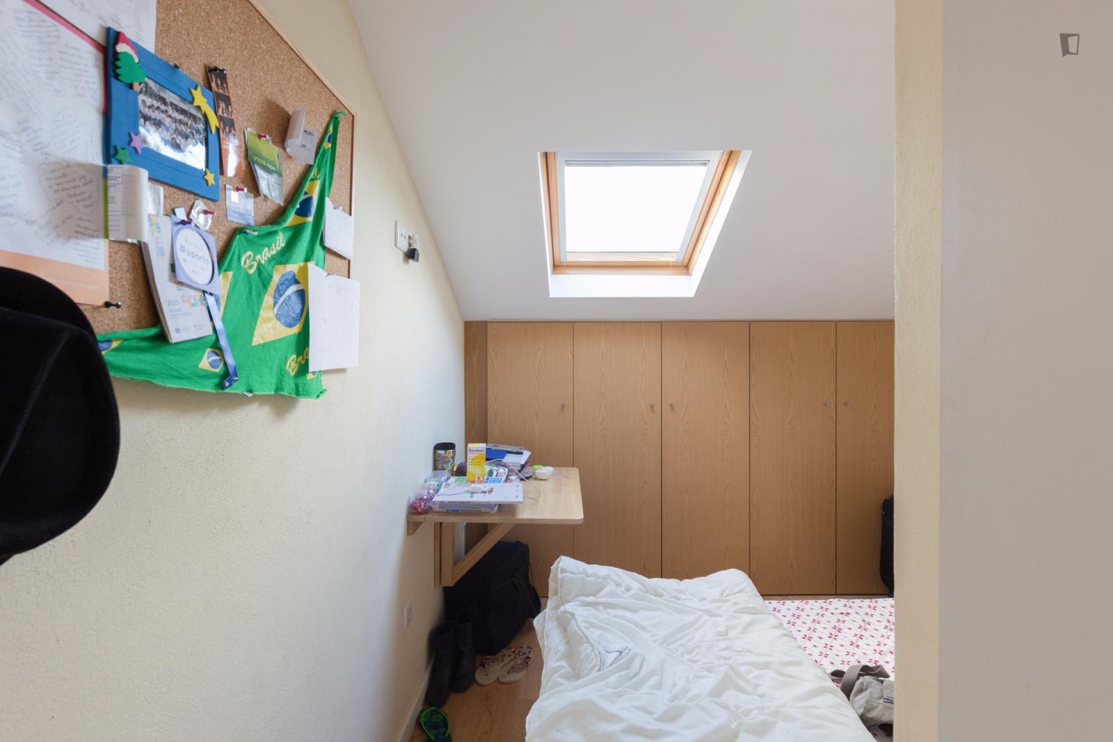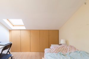 Located on the roof it has a roof window and a large closet. One of the quietest rooms in the house.